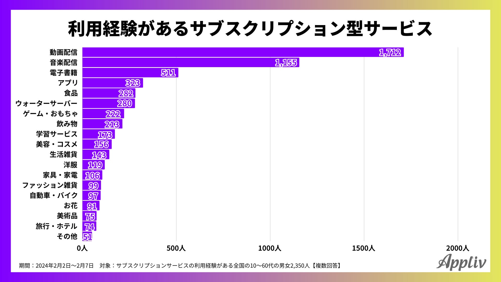 ナイル株式会社(本社:東京都品川区、 代表取締役社長:高橋飛翔、 以下ナイル)が運営するスマートフォンユーザー向けアプリ情報メディア「Appliv(アプリヴ)」にて、サブスクリプション型のサービス利用経験がある10~60代の男女605人を対象に、2024年2月2日~7日の期間、サブスクリプションサービスの利用実態に関するアンケート調査を実施しました。