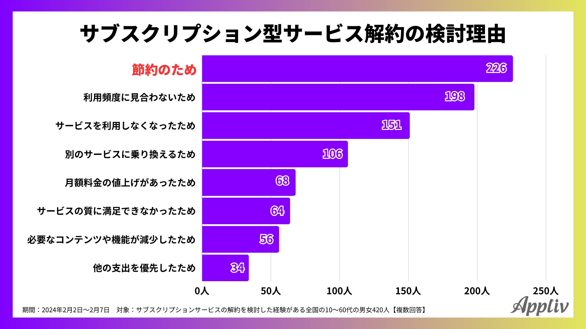 サブスクサービスの解約を検討したことがある人に、その理由を聞いてみた結果、最も多いのは「節約のため」で226人でした。全体の半数を超える人数が、毎月の固定費を減らすために解約を検討しているようです。