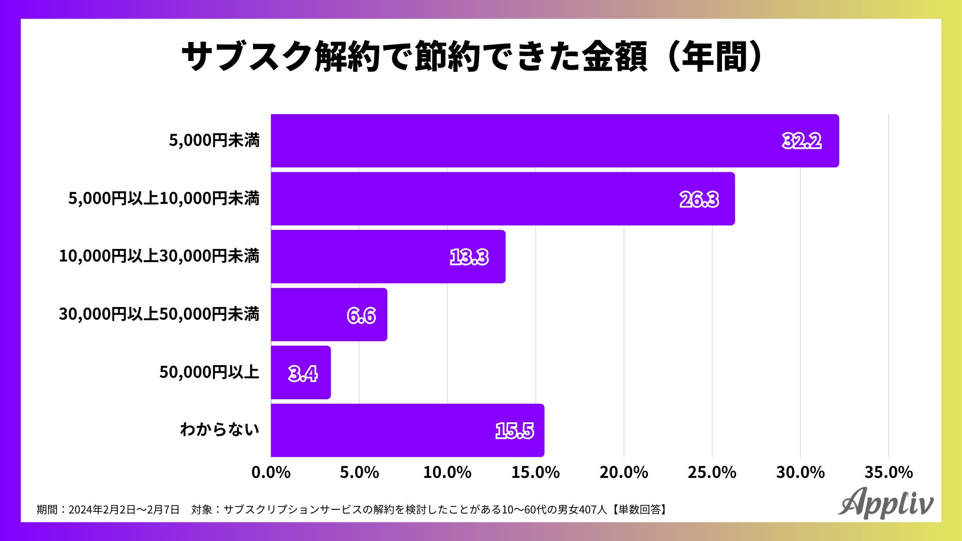 サブスクサービスを解約したことで節約できた年間の金額を尋ねると、「5,000円未満」が最も多く、32.2%でした。