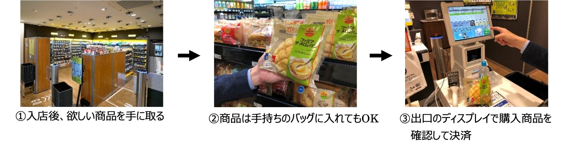 仕組みは、天井に設置されたカメラの情報から入店したお客さまと手に取った商品をリアルタイムに認識します。出口付近に設置された決済端末のディスプレイに購入商品と合計金額が自動で表示され、ファミペイを含むバーコード決済、交通系電子マネー、クレジット、現金で支払いが可能であり、スピーディにお買い物ができます。