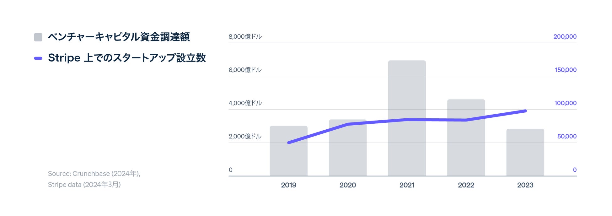 - 昨年 VC からの資金調達が 2018 年以降で最低水準になった中で、Stripe 全体でスタートアップ企業の設立が記録的なものとなった
