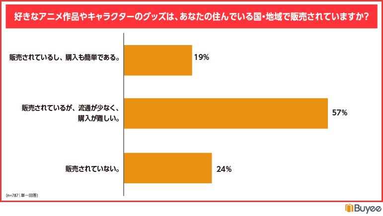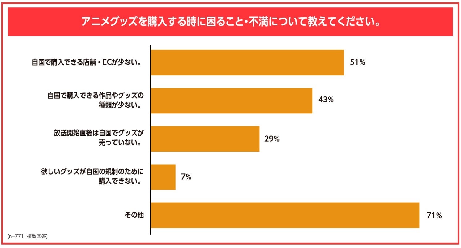 好きなアニメ作品のキャラクターグッズが自身の住んでいる国・地域で販売されているか、という質問に対しては、販売されているが購入が難しいという回答が最も多くなりました。また、グッズ購入にあたっての課題では、自国で購入できるサイトや店舗が限定的であるとうい回答が多数を占め、アニメグッズの購入環境はまだまだ限定的であることが分かります。