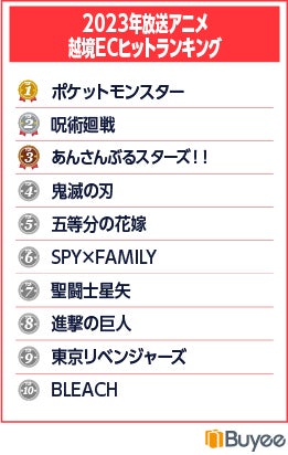 BEENOS 株式会社(東証プライム:3328)は、「BEENOS 越境EC×アニメ ヒットランキング2023」を発表しました。越境EC支援NO.1(※1)であるBEENOSグループの海外ユーザー購買データをもとに、2023年に新作や新シリーズとして放送を開始したアニメ作品を対象に、海外でグッズが動いた作品や関連商品などを紹介いたします。