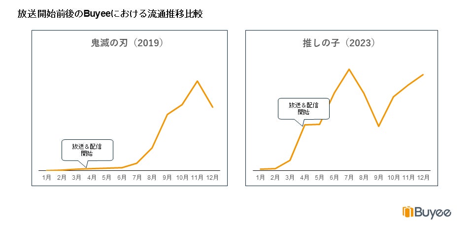 世界的なパンデミック前の2019年に放送が開始された「鬼滅の刃」と2023年に放送が開始された「推しの子」を比較すると、「鬼滅の刃」は放送開始から流通上昇までに約3か月かかっていますが、「推しの子」は放送開始直後から流通が上昇しており、「世界同時消費」が起きていることが分かります。