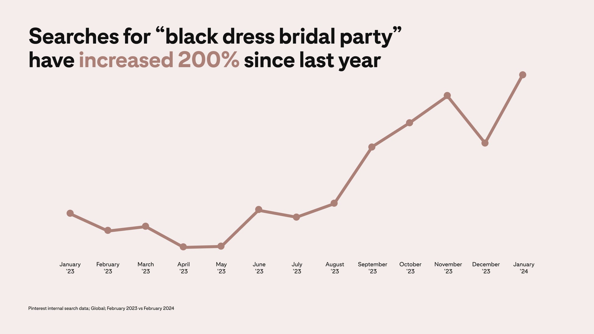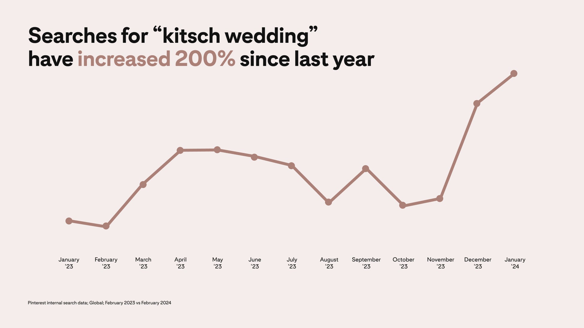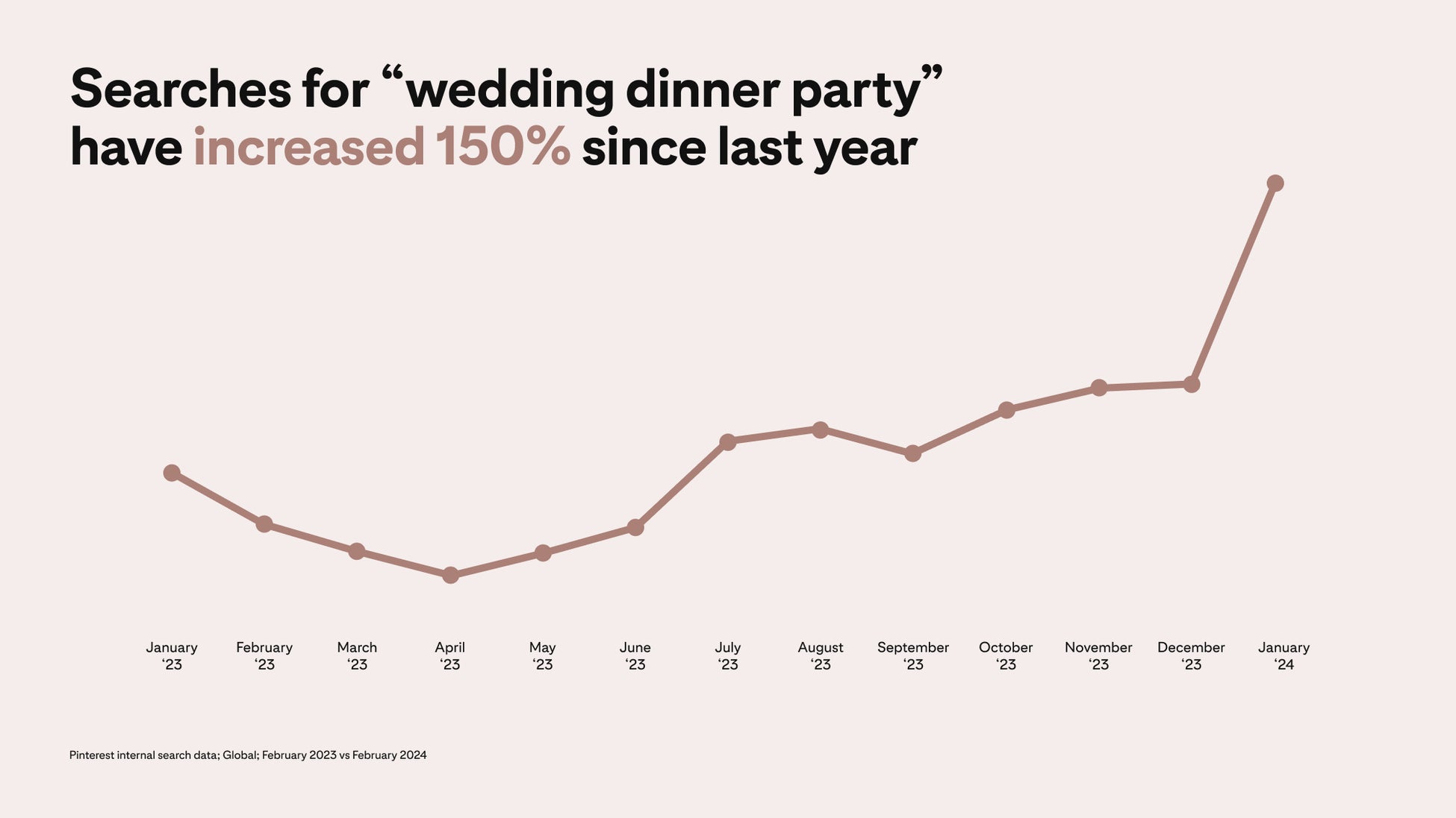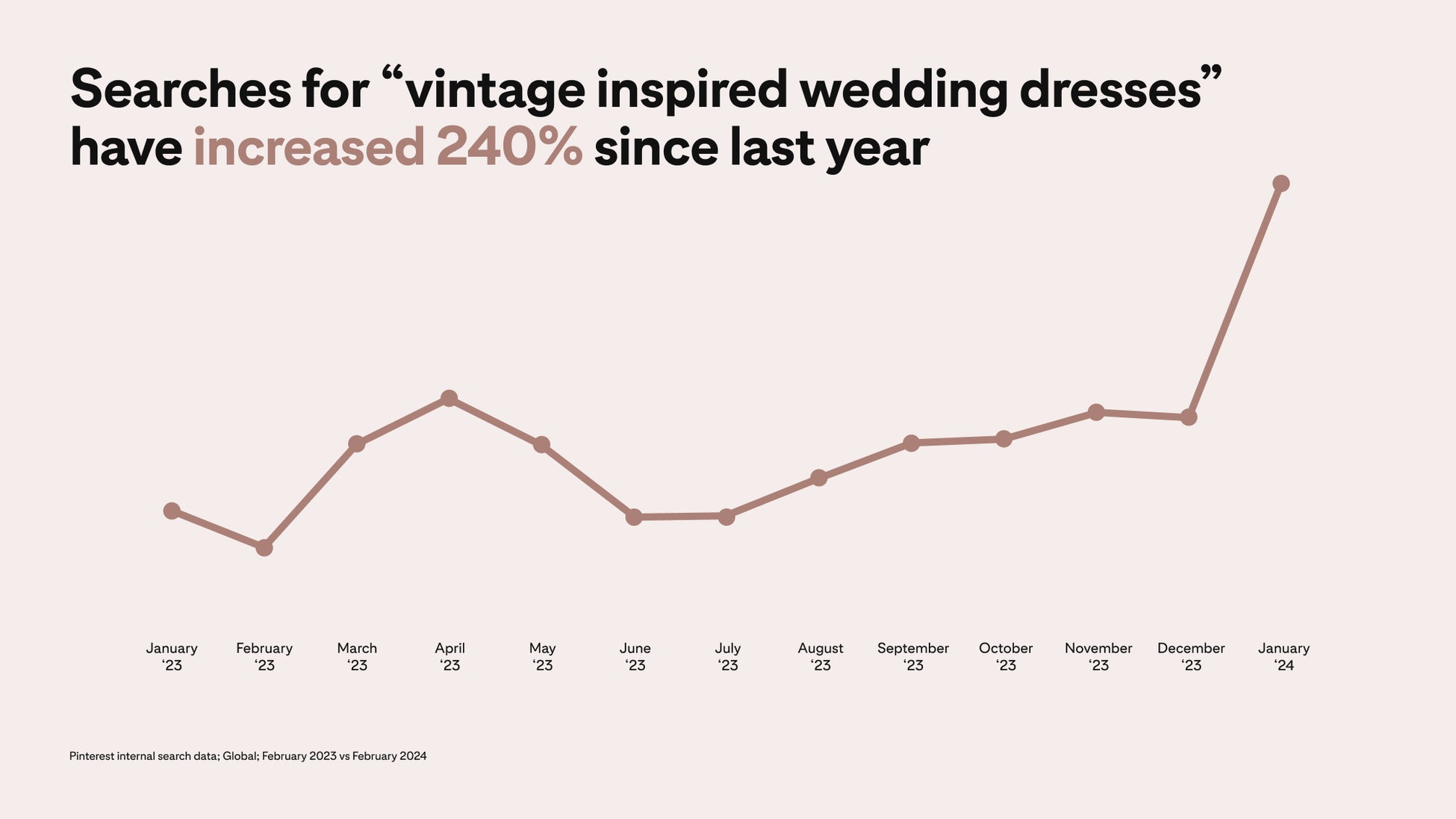 ビジュアル探索プラットフォームの Pinterest は本日、ユーザーがプラットフォーム上で検索し保存した内容をもとに、2024年のウェディングトレンドを発表し、結婚式のテーマやファッションなど、今人気のウエディングスタイルを明らかにしました。