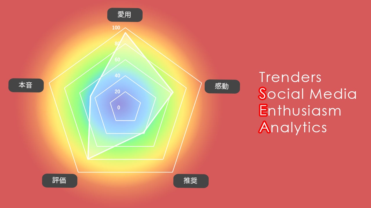 「熱量スコア」とは、トレンダーズが独自に開発したSNS分析手法であり、AIのディープラーニング、転移学習(学習済みの知識の別領域への応用)のテクノロジーを使って、“SNS 投稿内容の熱量”を測定するものです。さらに、熱量の種類を「愛用」・「感動」・「推奨」・「評価」・「本音」の五軸でカテゴライズすることで、どのような熱量傾向があるかをスコア化します。これまで、Instagramのフィード投稿を対象に分析を行ってきました。