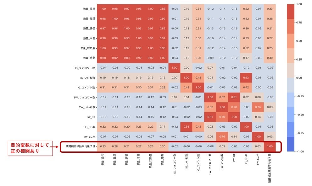 上記条件のもと、データセット相関行列を見ると、五つの熱量スコアはどれも目的変数に対して正の相関が見られます。また、各SNSの数値の中で、正の相関が見られるものは熱量スコアのみであることもわかりました。ただし五つの熱量スコアは各項目相関係数も非常に高いため、KPIとしては各熱量スコアの合計である「総熱量スコア」のみで評価すべきと考えています。