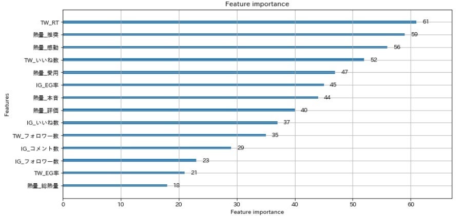 また、機械学習モデルにより算出した各説明変数重要度を見ると、Xのリポスト数やいいね数も、購買人数を予測・説明する上で重要な変数であることがわかりました。熱量スコア以外は目的変数との強い相関は見られなかったため、KPIとしての重要度は下がるものの、参考指標として見るべきと考えています。