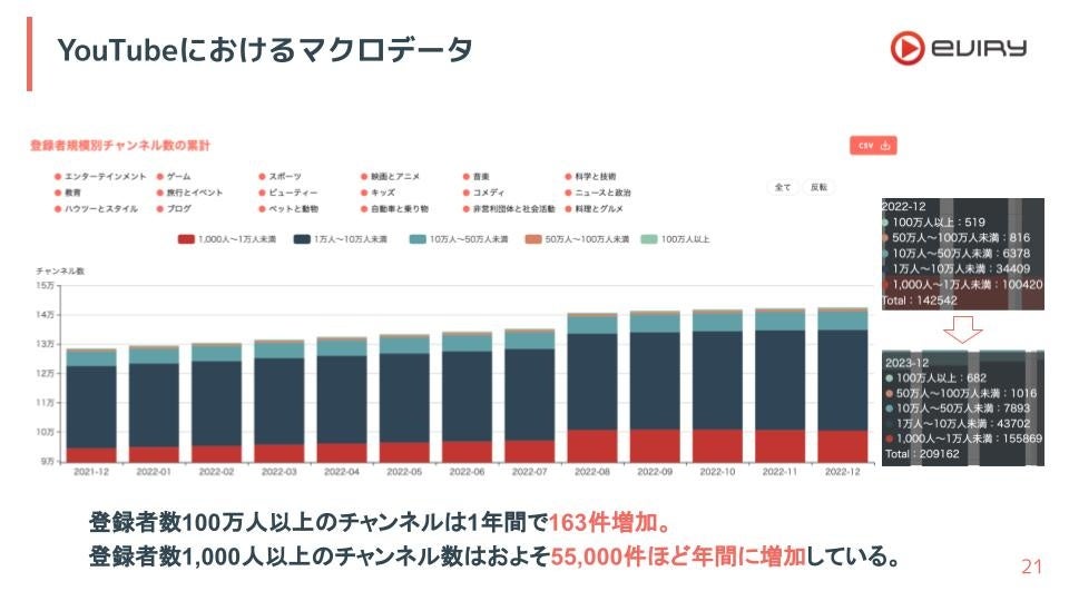 国内最大級のYouTubeデータ分析ツール『kamui tracker(カムイトラッカー)』を運営している株式会社エビリー(本社:東京都渋谷区、代表取締役社長:中川恵介、以下エビリー)は、2022年に引き続き、YouTube・動画SNS市場概況レポートを公開いたしました。YouTubeデータの調査にあたっては、当社の『kamui tracker』を活用しています。