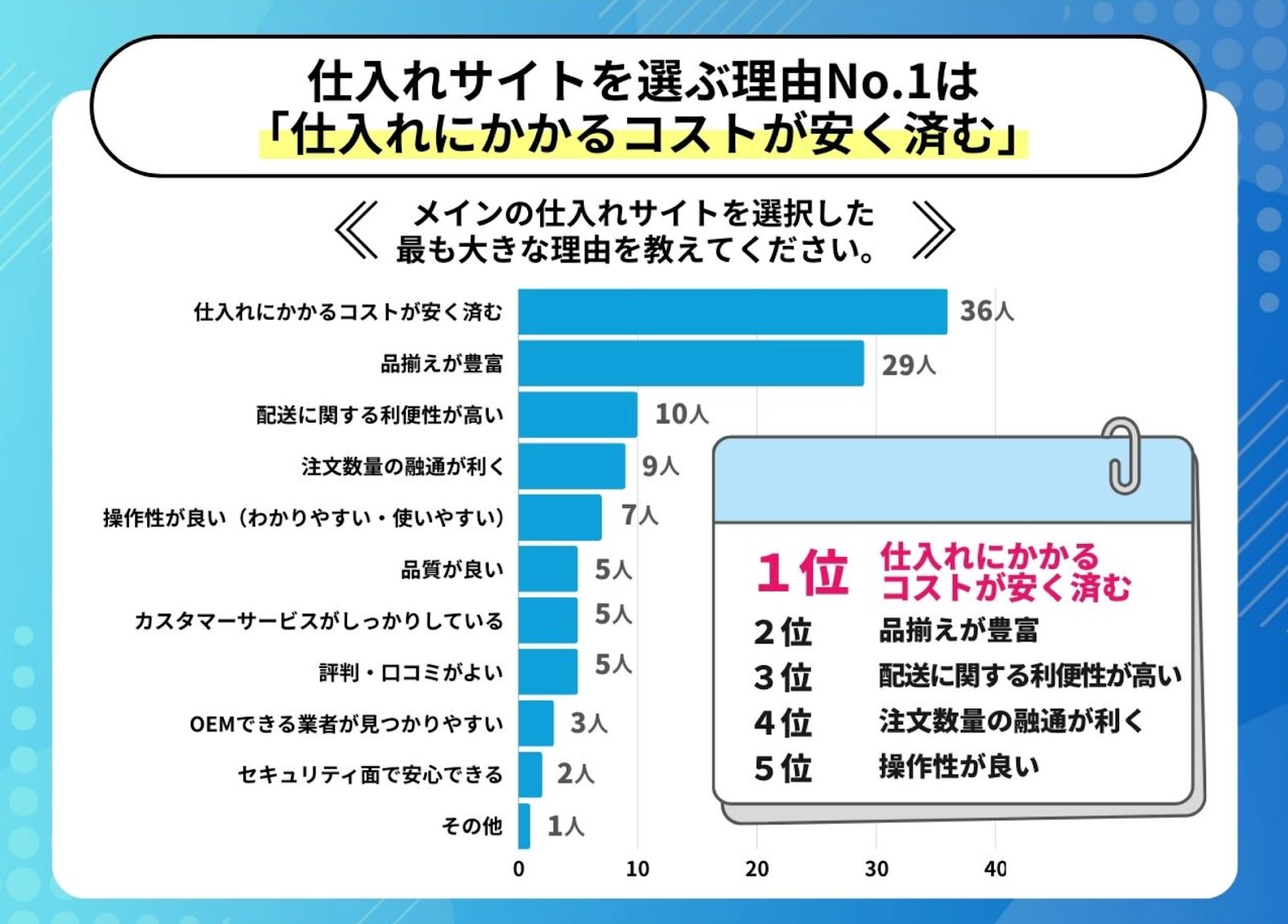 何を重視して選んだか具体的な理由として挙げられたものは「仕入れにかかるコストが安く済む」と回答した人が多く得票数は36件、次いで「品揃えが豊富」と回答した人は29件という結果になりました。