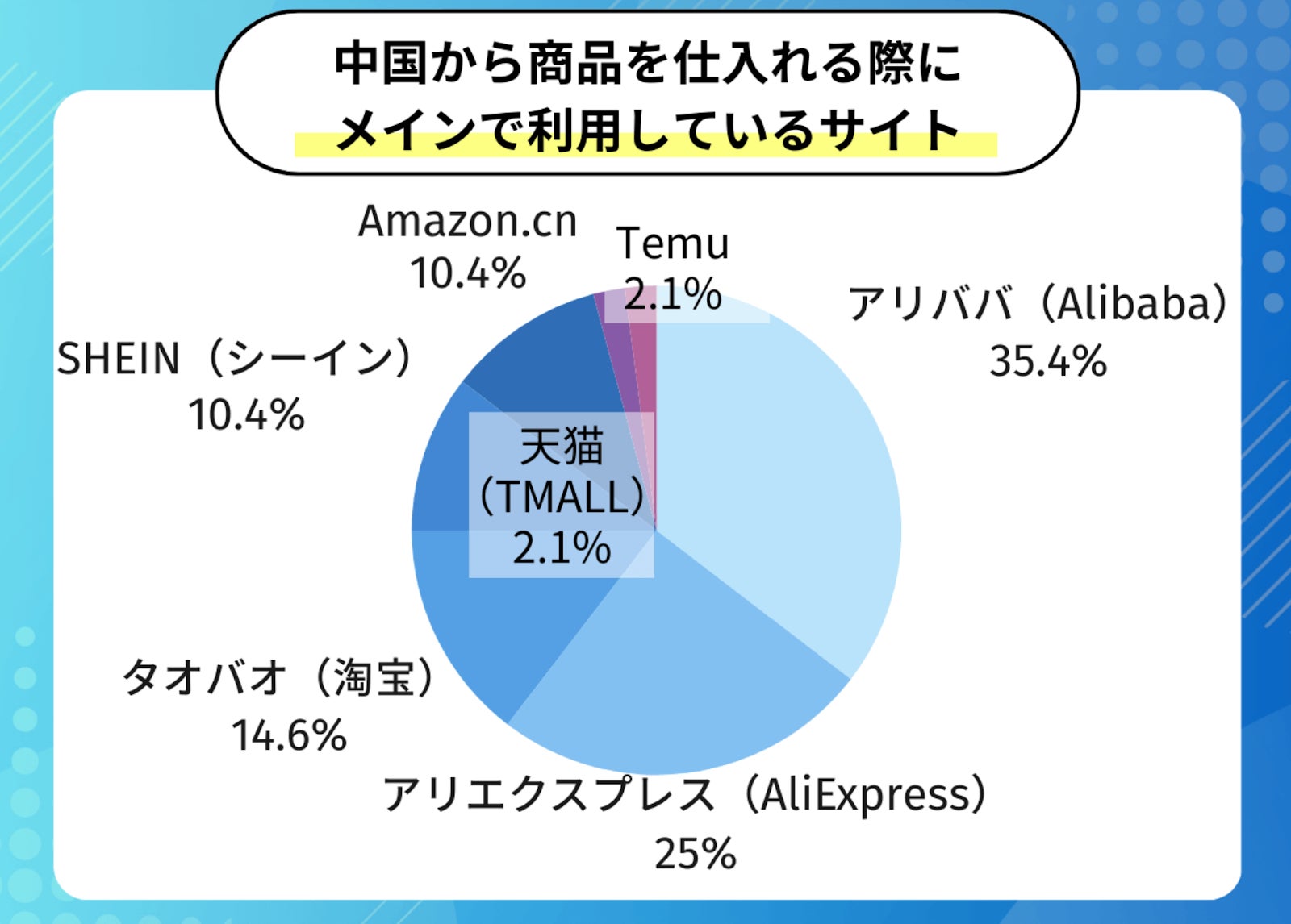 メインで利用する仕入れ先として挙げられたツールは(※1)「アリババ(Alibaba)」が最も多く35.4%、次いで(※2)「アリエクスプレス(AliExpress)」が25.0%という結果になりました。