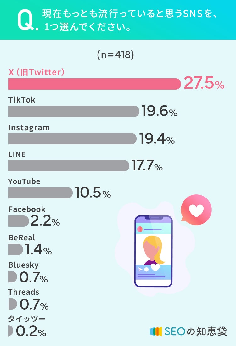 ■現在もっとも流行っていると思うSNS、27.5%が「X(旧Twitter)」