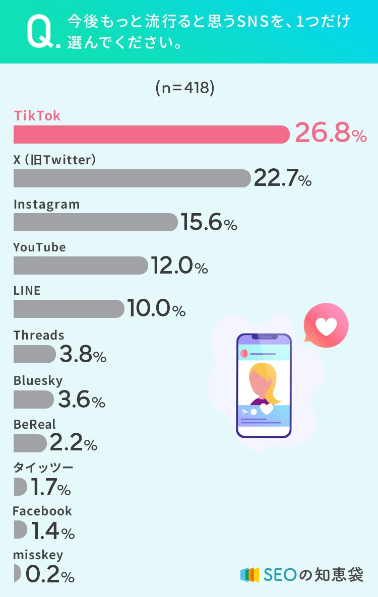 今後流行りそうなSNSは26.8%で「Tiktok」がもっとも選ばれていました。
