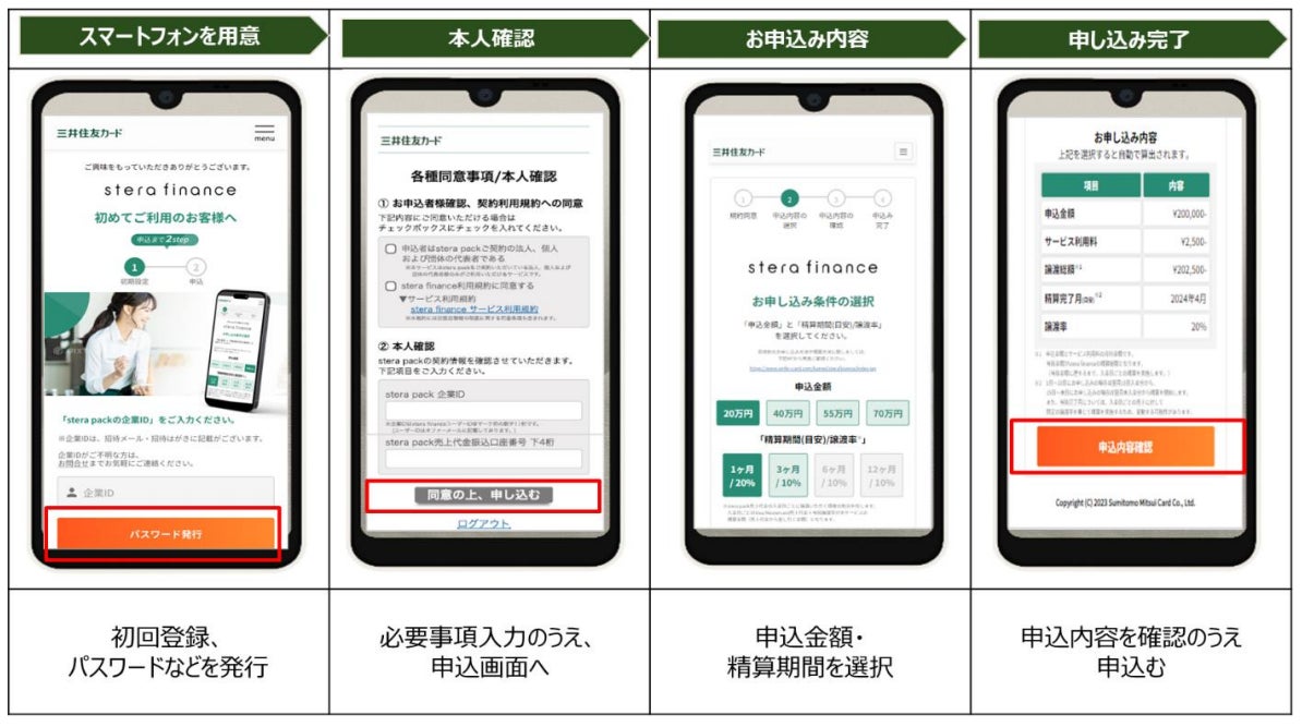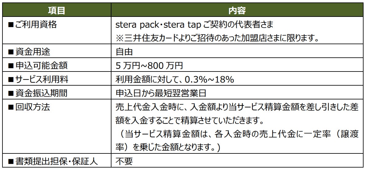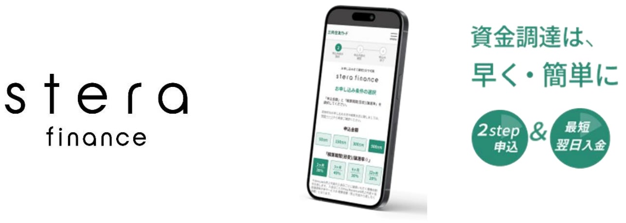 ※ stera financeはSMBC GMO PAYMENT株式会社が提供する「stera pack」及び「stera tap」をご契約のお客さまにご提供をさせていただいております。