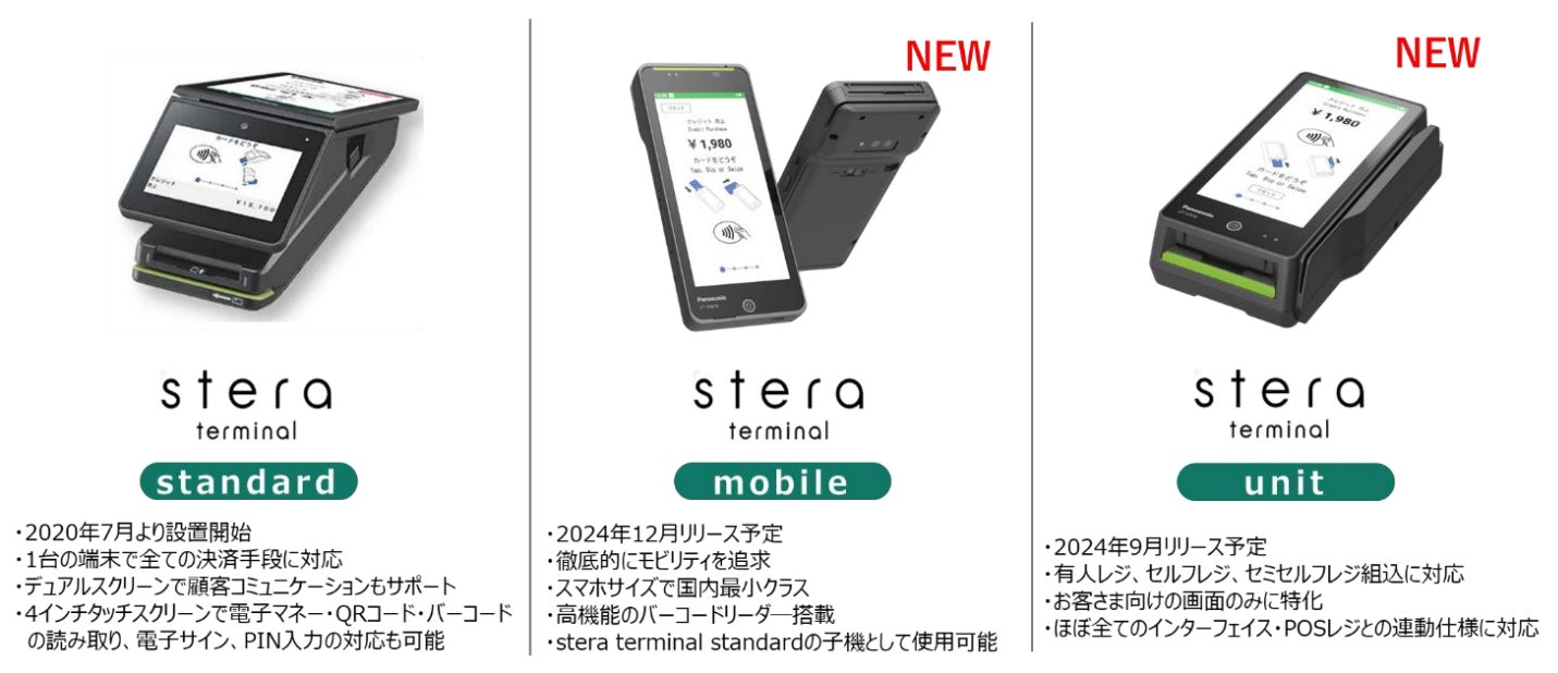 オールインワン端末「stera terminal」の機能を活かしつつ、事業者の業態に合わせた2種類のプロダクトをラインアップに追加します。これまでの「stera terminal」を「stera terminal standard」と位置づけ、「stera terminal mobile」と「stera terminal unit」をリリースいたします。