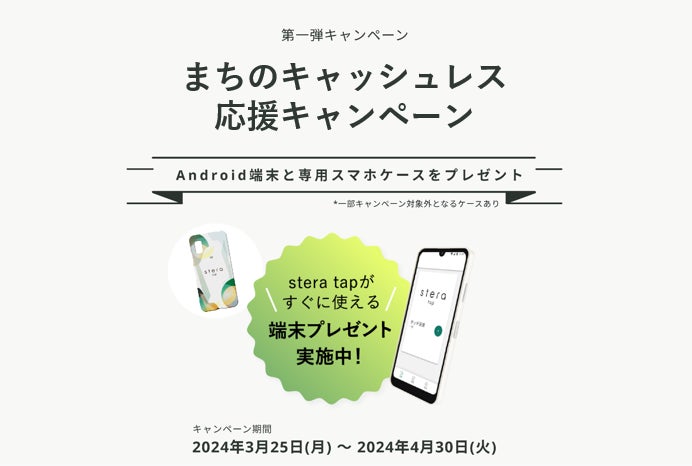 三井住友カードは、「stera tap」の導入をサポートするキャンペーンを順次実施予定です。その第1弾として、「まちのキャッシュレス応援キャンペーン」を実施します。2024年3月25日(月)から2024年4月30日(火)までの間にお申込みいただいた加盟店さまを対象に、 Android 端末と専用ケースをプレゼントいたします。この機会に、ぜひ、お申し込みください。