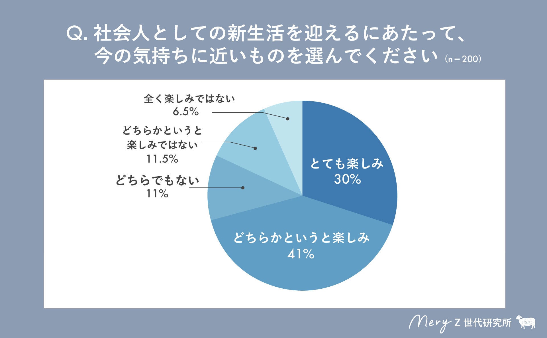 4月から新社会人になるZ世代の男女200名に、新生活を迎えるにあたっての今の気持ちを聞いたところ、「どちらかというと楽しみ」(41%)と「とても楽しみ」(30%)の合計が全体の7割を超える結果となった。