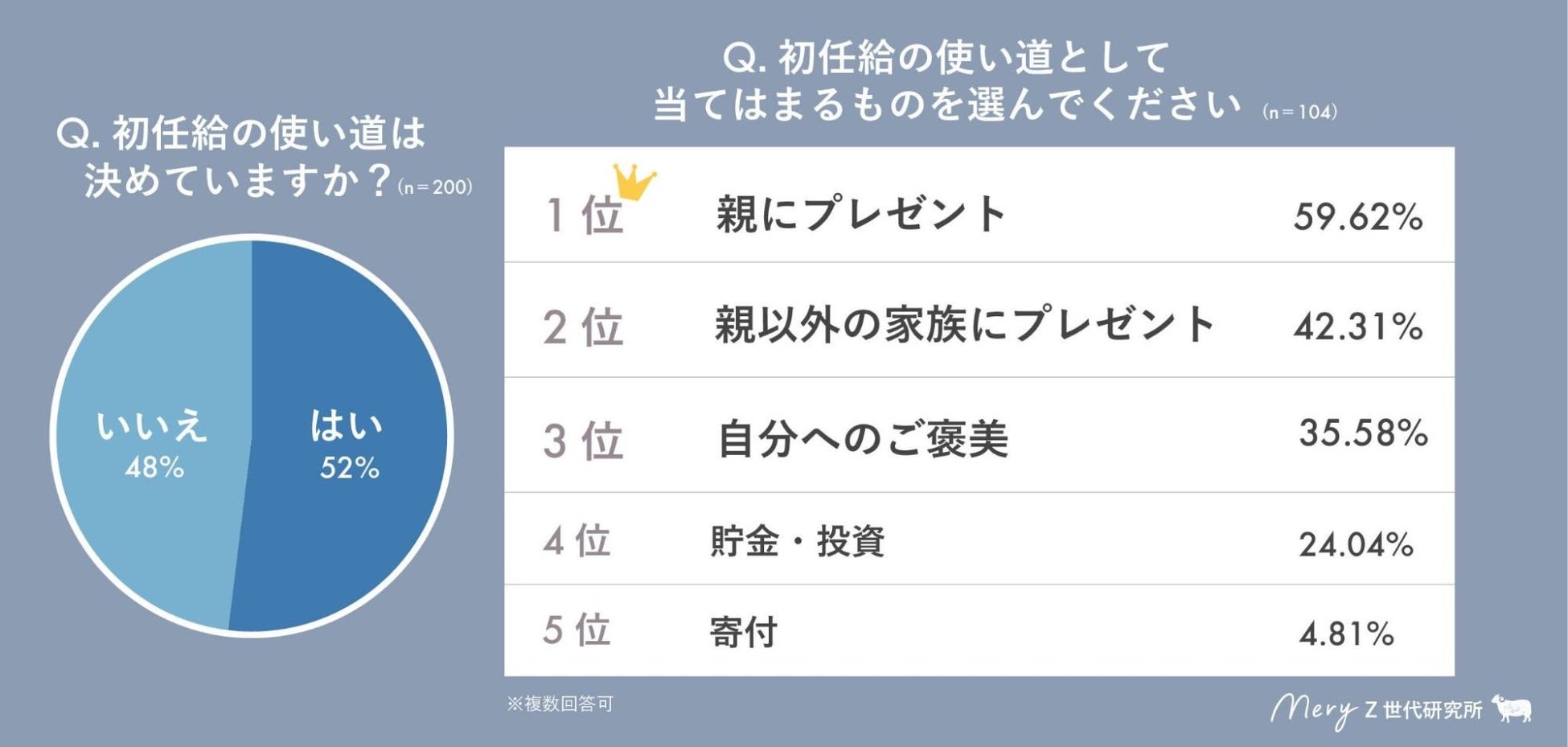 初任給の使い方についての質問では、使い方を決めている人が全体の52%を占め、使い道についてのアンケートでは約6割が「親へのプレゼント」と回答した。
