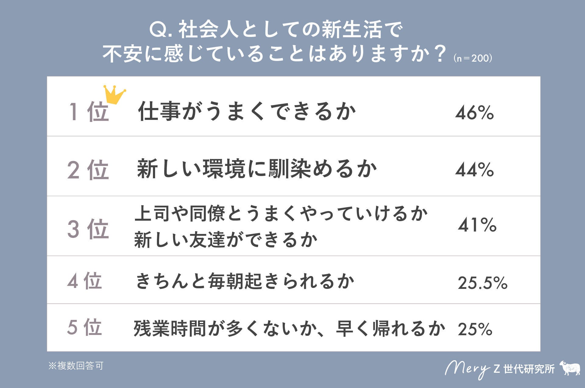 続いて、楽しみに感じていること/不安に感じていることを聞いたところ、楽しみに感じていることでは「給与・ボーナスをもらえること」(47.5%)が最も多く、次いで「新しい人間関係が広がること」(41.00%)が多い結果となり、不安に感じていることでは「仕事がうまくできるか」(46%)が最も多く、「新しい環境に馴染めるか」(44%)が続く結果となった。