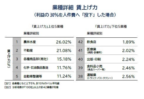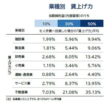 業種別の賃上げ力をみると、当期純利益の30%分を人件費へ「投下」した場合、最も賃上げ力が大きいのは「不動産業」で、21.08%分相当の賃上げが可能だった。不動産業では、特にディベロッパーなどの開発部門で不動産投資などによる収益回復から大幅な増益となった企業が多く、賃上げ力が他産業に比べて突出した大きさとなった。