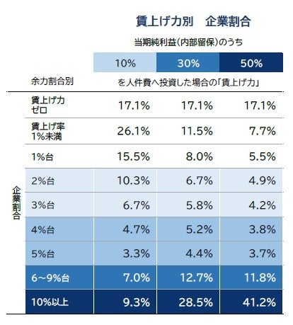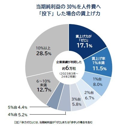 ただ、賃上げ力の詳細を見ると、純利益のうち「10%」「30%」「50%」をそれぞれ人件費に充てた場合のいずれも賃上げ力が「ゼロ」の企業が17.1%を占め、収益力に乏しく賃上げができない=「無い袖は振れない」企業もみられた。
