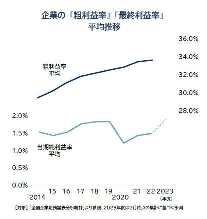 企業における「稼ぐ力」は回復傾向にある。帝国データバンクが有する日本企業の財務統計では、2022年度における企業の粗利益率・当期純利益率各平均のいずれも前年を上回った。特に、当期純利益率は23年度に大幅な回復が想定され、過去10年でも高い水準に到達する可能性がある。「収益性が乏しく、賃上げ原資が確保できない」とする声も多い一方、企業全体では採算性が着実に改善傾向にある。こうしたなかで、内部留保へと回りやすい純利益の3割を人件費へ投下することで、政府要求や組合要求平均を大きく上回る、平均6%の賃上げ率に相当する「賃上げ力」が、日本企業に眠っている可能性がある。人手不足が深刻化するなか、利益に見合った十分な還元を従業員へ振り向ける「人的資源への投下」姿勢が定着するか注目される。