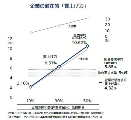 帝国データバンクは、保有する企業データベースのうち2023年2月-24年2月間に決算を迎えた企業財務データ(約97万社・780万期収録)を対象に、企業が引き上げ可能な賃金水準について試算・分析を行った