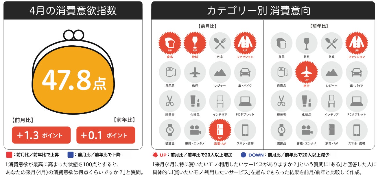 2024年4月の消費意欲指数は47.8点。前月比で+1.3ptと上昇し、前年比では+0.1ptで横ばいとなりました。