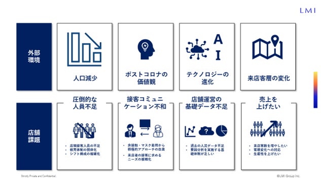 店舗運営を取り巻く環境は、技術の進歩や社会情勢などを背景に大きく変化し、それに合わせてお客様に喜んでもらえる店舗づくりの在り方を日々更新していくことが求められています。LMIでは、「空間=ハード」と「人=ソフト」の両面から全体設計を行い、外部環境変化と店舗運営における定性的な課題を踏まえ、店舗空間および店舗運営の形をアップデートすることを提案していきます。