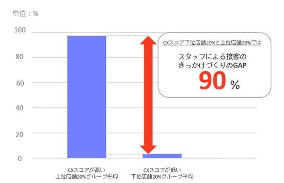 「接客のきっかけづくりをスタッフからしているか?」の結果の分析を進める中で、「接客へのスタンスがなし崩し的に“接客しない”形に移行している店舗が多い、という危機感をもつ状態になっていました。約80問の設問からなる今回の調査の中でも、上位グループの平均スコアが97%という「ほぼ必ず実践できている」という状況に対して、下位グループの平均スコアが5%となっていました。