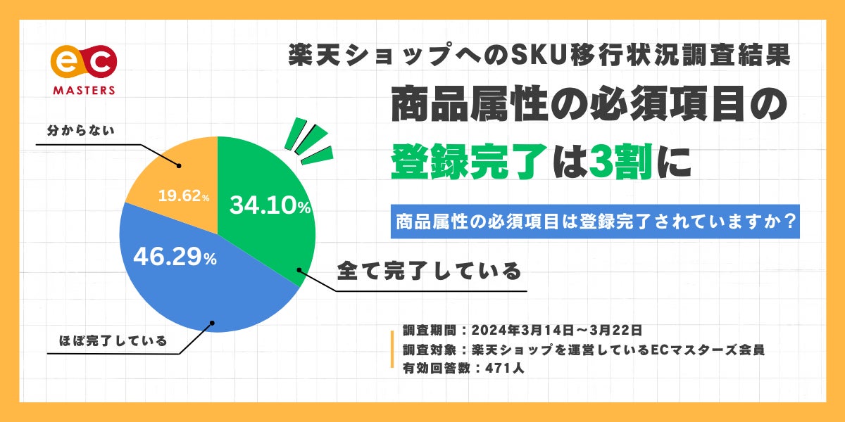 日本全国の楽天ショップ約2,500社が所属する「ECマスターズクラブ」を運営する日本ECサービス株式会社(本社:東京都渋谷区、代表取締役:清水将平)は、楽天ショップ運営者向けにSKUの移行状況と商品属性の登録状況についての調査を実施しました。