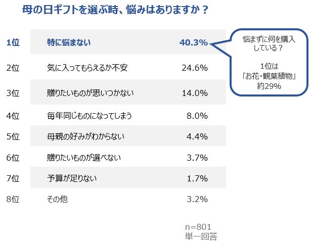 1.母の日ギフトを選ぶ時、悩みはありますか?という質問に対して、約40%の人が「特に悩まない」と回答しています。悩まずに何を購入しているか?深掘りしてみると、約29%の人が「お花・観葉植物」ということが分かりました。