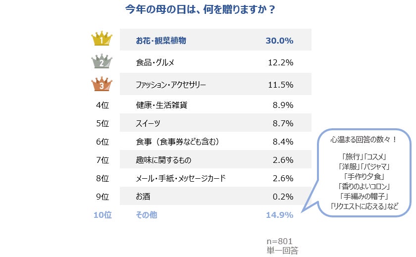 2. 今年の母の日は、何を贈りますか?という質問に対して、30%の人が「お花・観葉植物」と回答し、ダントツのトップでした。次に回答が多かった「その他」を調べてみると、「旅行」「コスメ」「洋服」「パジャマ」「手作り夕食」「香りのよいコロン」「手編みの帽子」「リクエストに応える」など、お母さまへの愛情が感じられる、心温まる回答の数々でした。