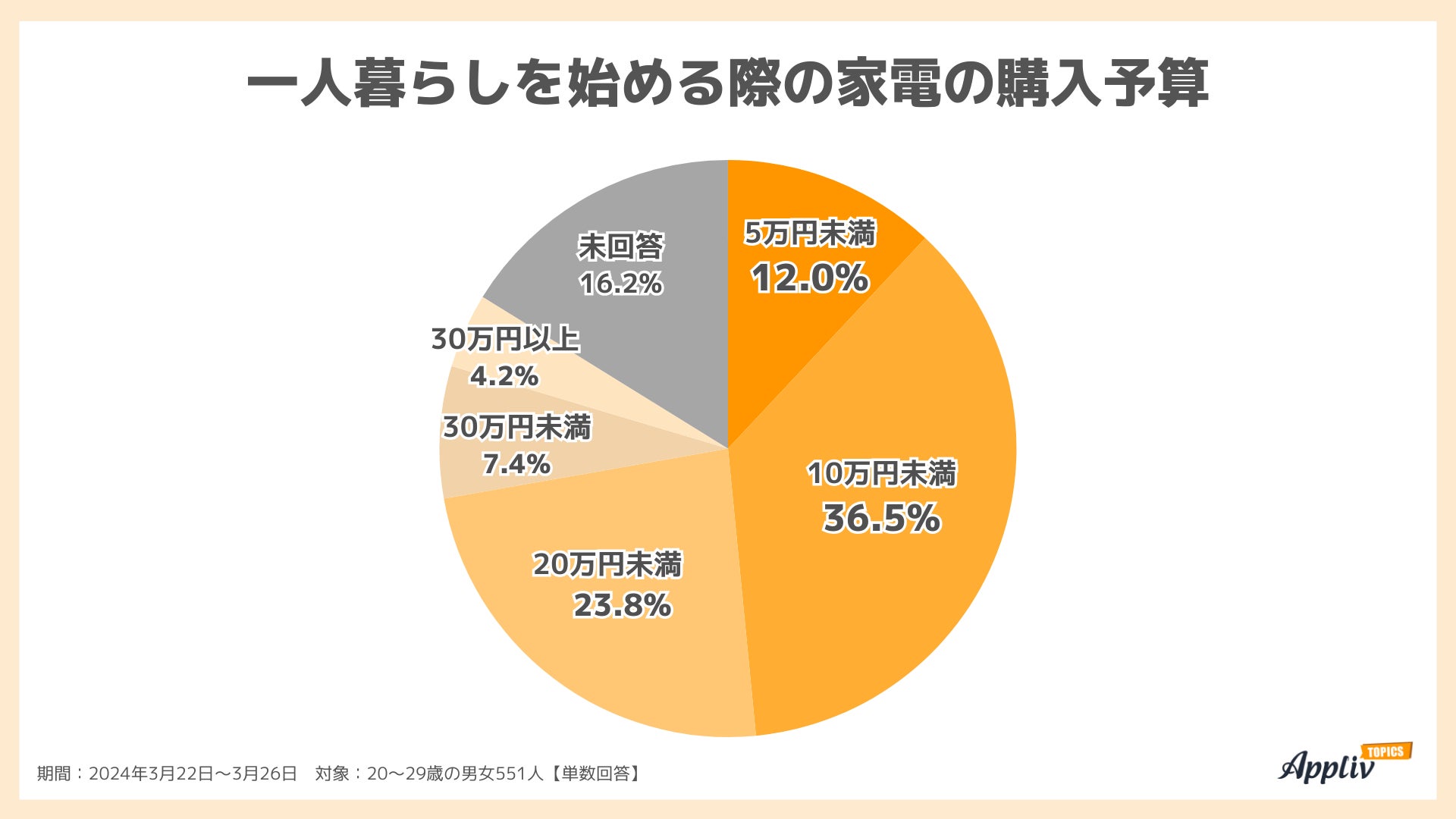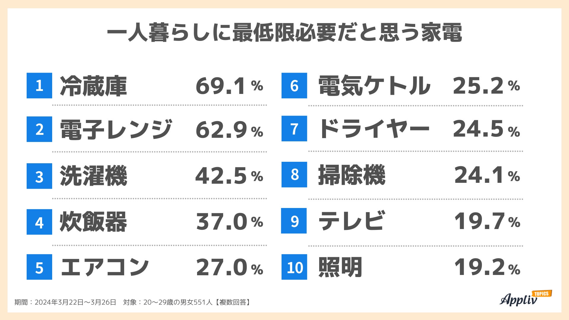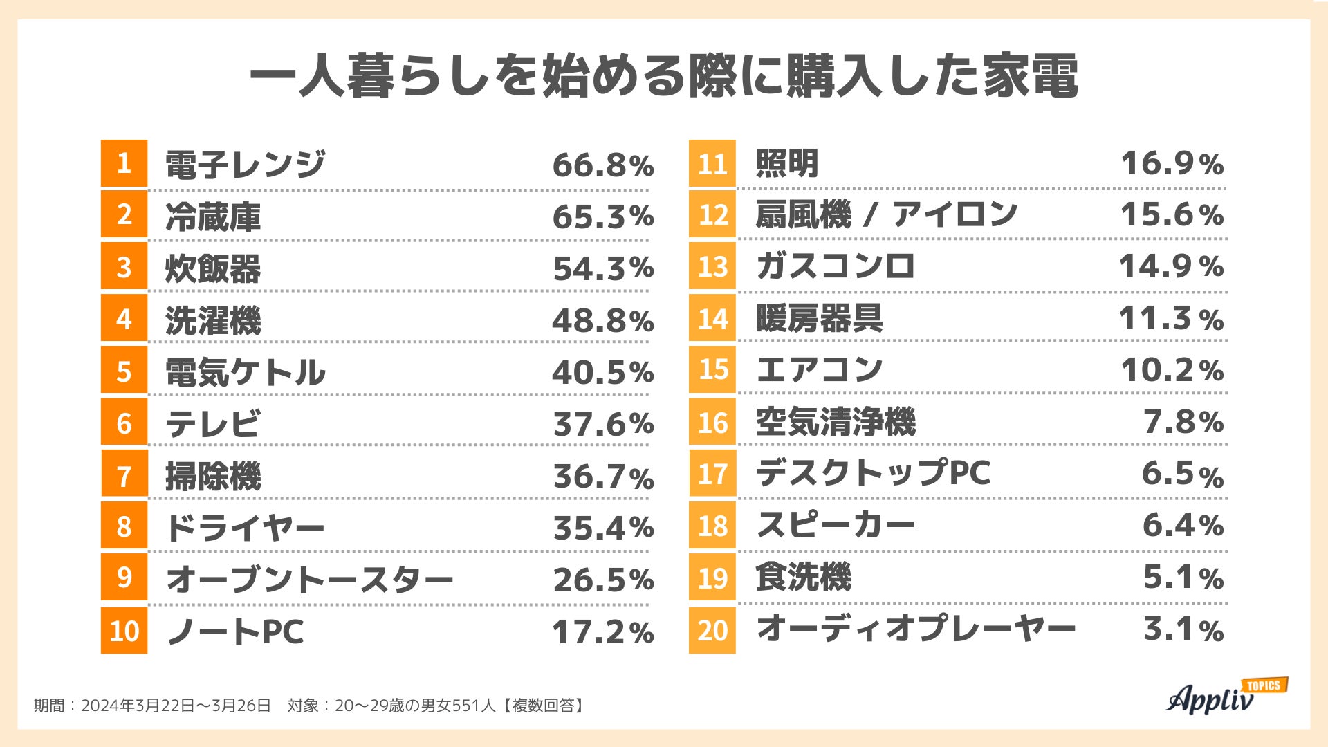 「Appliv TOPICS」は20代男女551人を対象に、2024年3月22日~3月26の期間で、一人暮らしの家電購入関するアンケートを実施しました。
