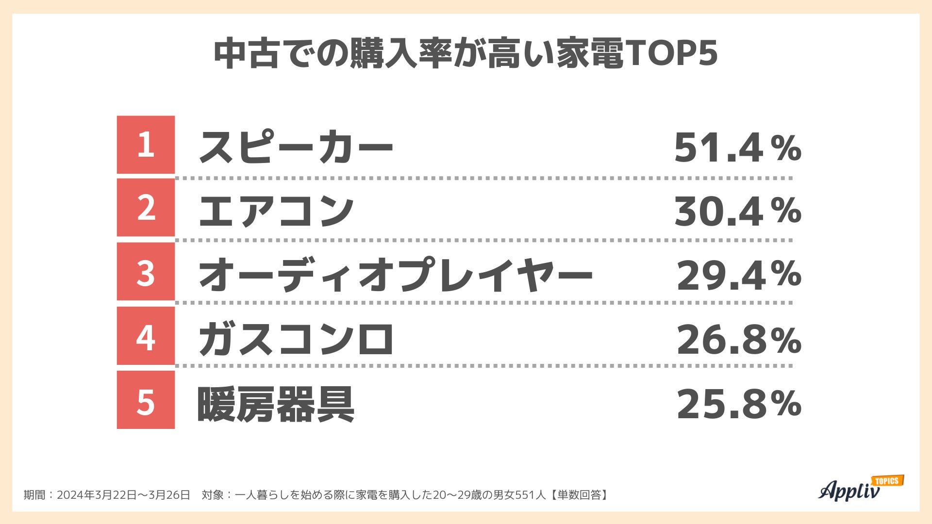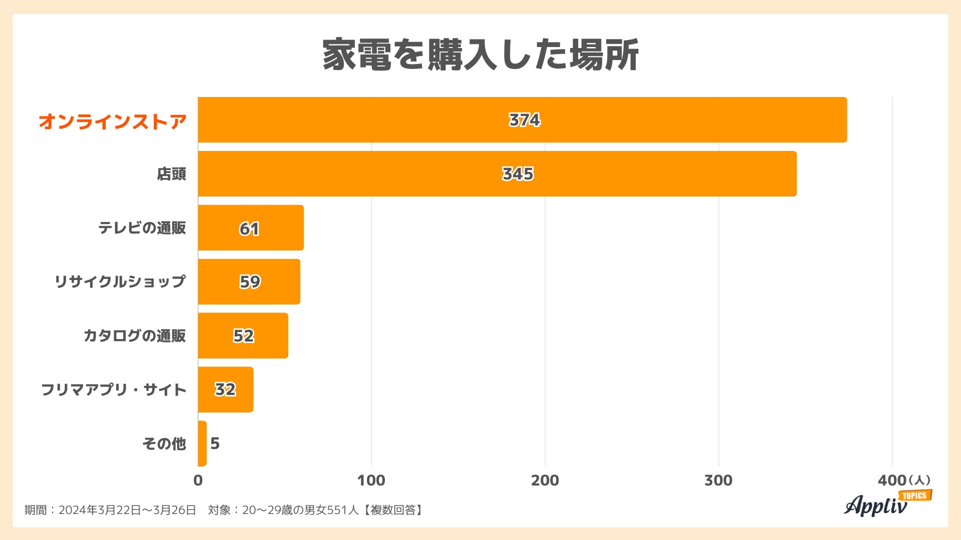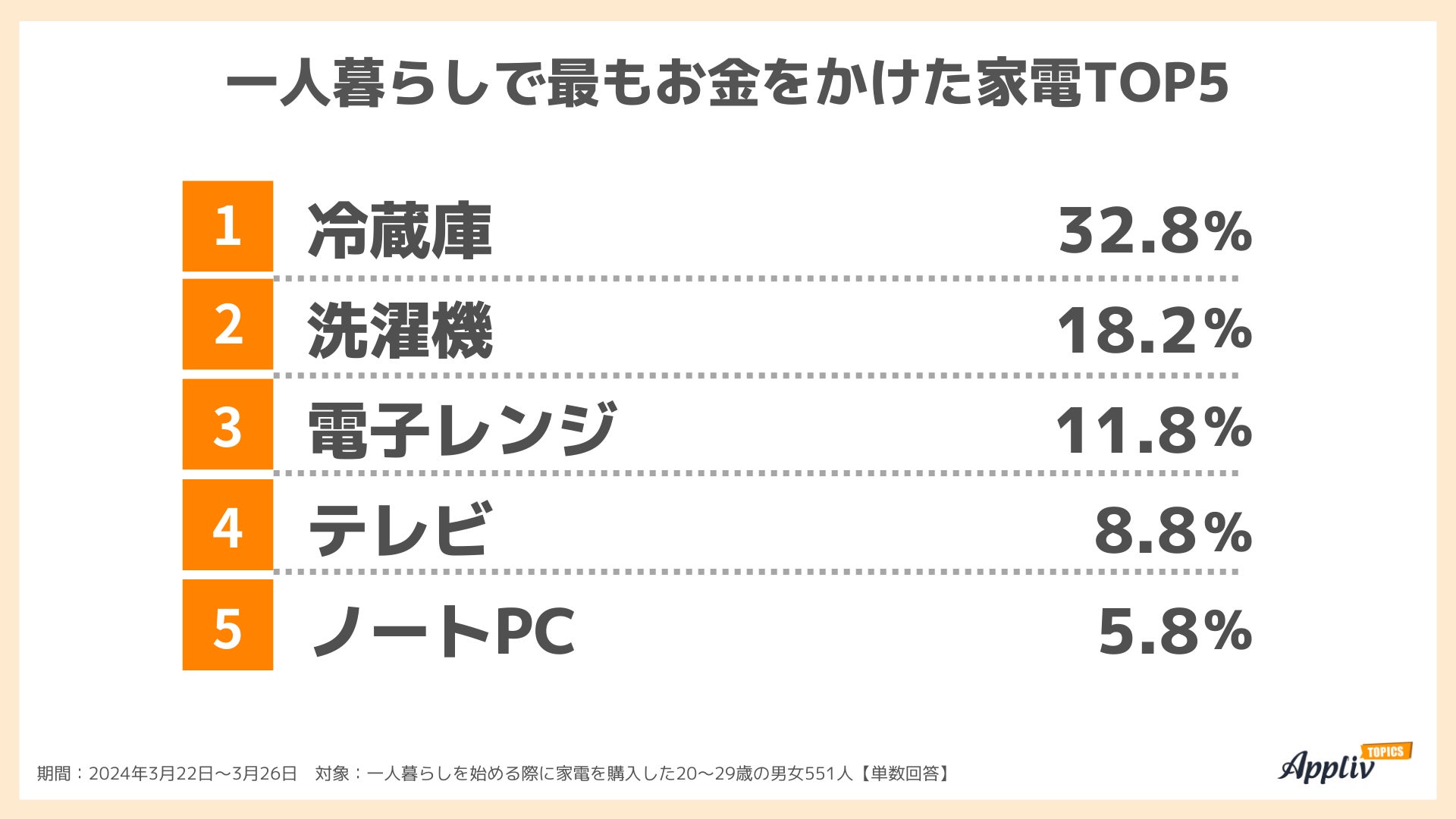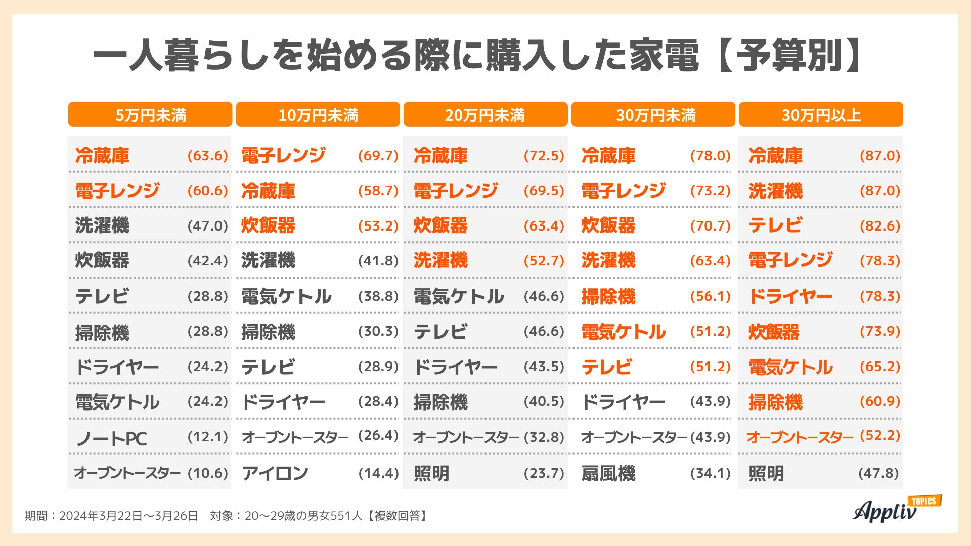 「Appliv TOPICS」は20代男女551人を対象に、2024年3月22日~3月26の期間で、一人暮らしの家電購入関するアンケートを実施しました。