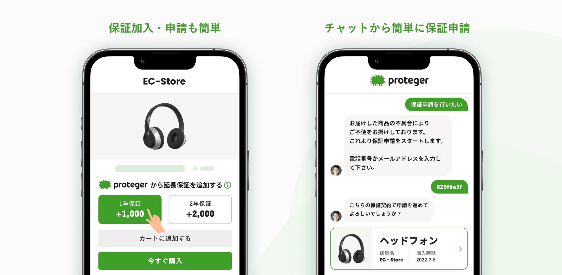 延長保証サービス「proteger」の導入費用は一切かからず、保証料による売上高向上、お客さまがECサイトで購入する際の不安軽減などが期待できます。また、お客さまは破損時の申請を簡単に行うことができ、24時間365日いつでもチャットで保証申請が可能となっております。