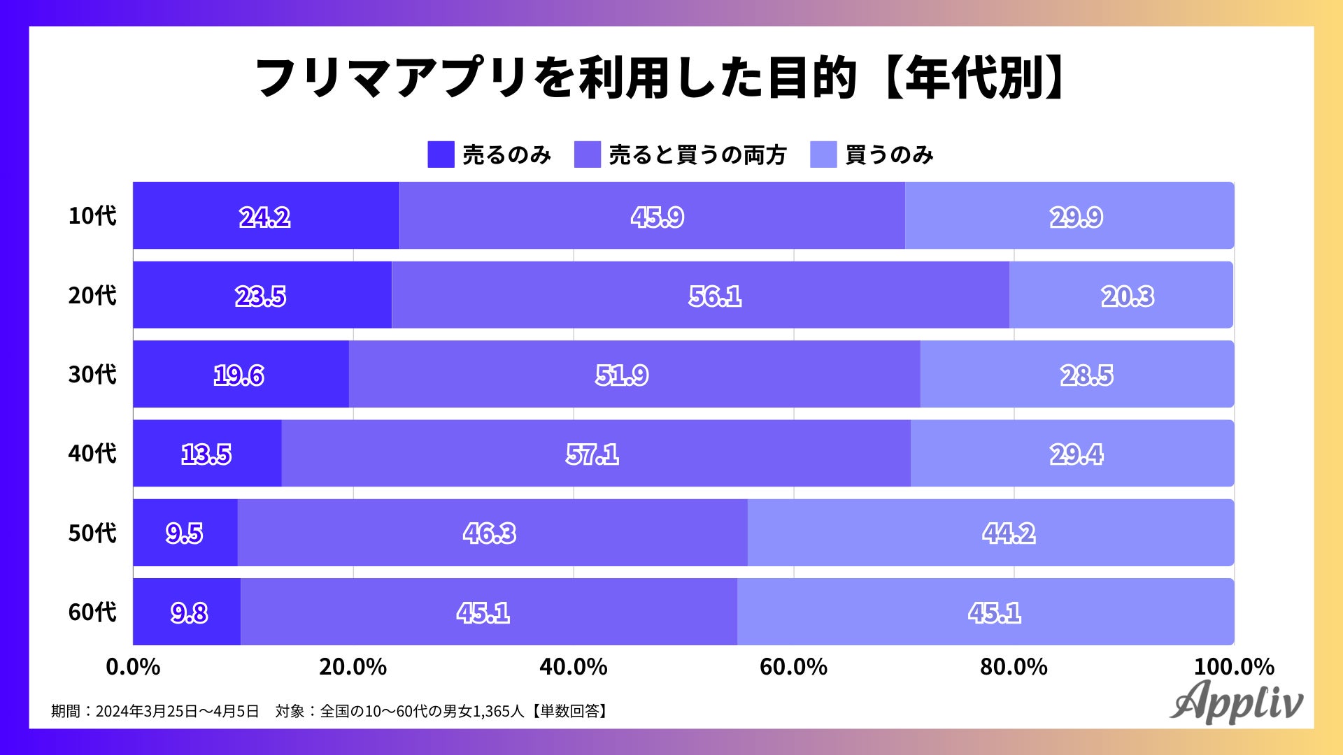 年代別に見てみると、「売るのみ」と回答した割合は若い年代が多く、最も多かったのは10代で24.2%でした。フリマアプリを利用する若い世代にとって、フリマは1つの収入源として活用されている可能性が考えられます。