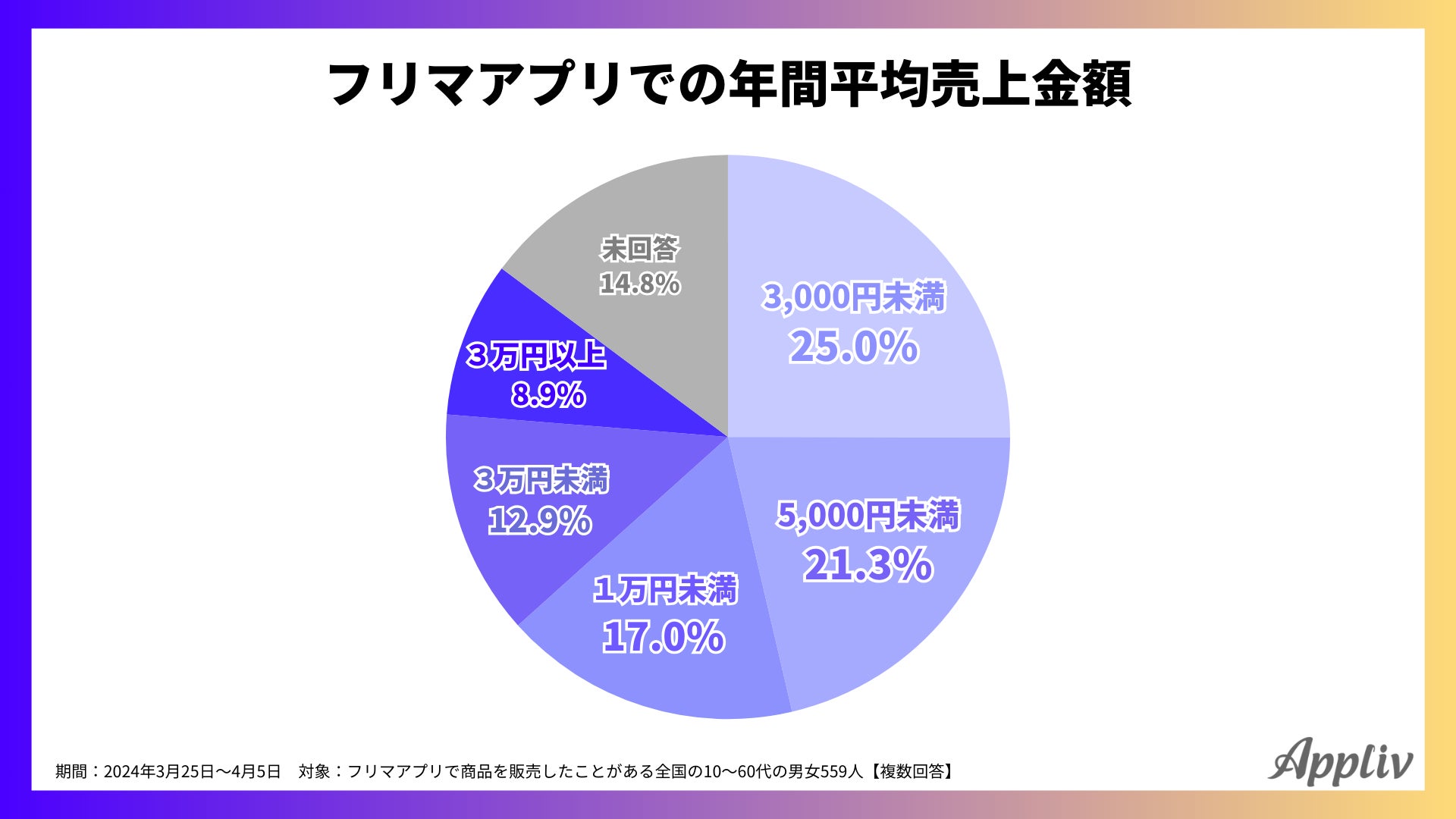フリマアプリで1年間に売り上げた平均金額を調べると、「3,000円未満(25.0%)」が最も多く、次いで「5,000円未満(21.3%)」、「1万円未満(17.0%)」でした。