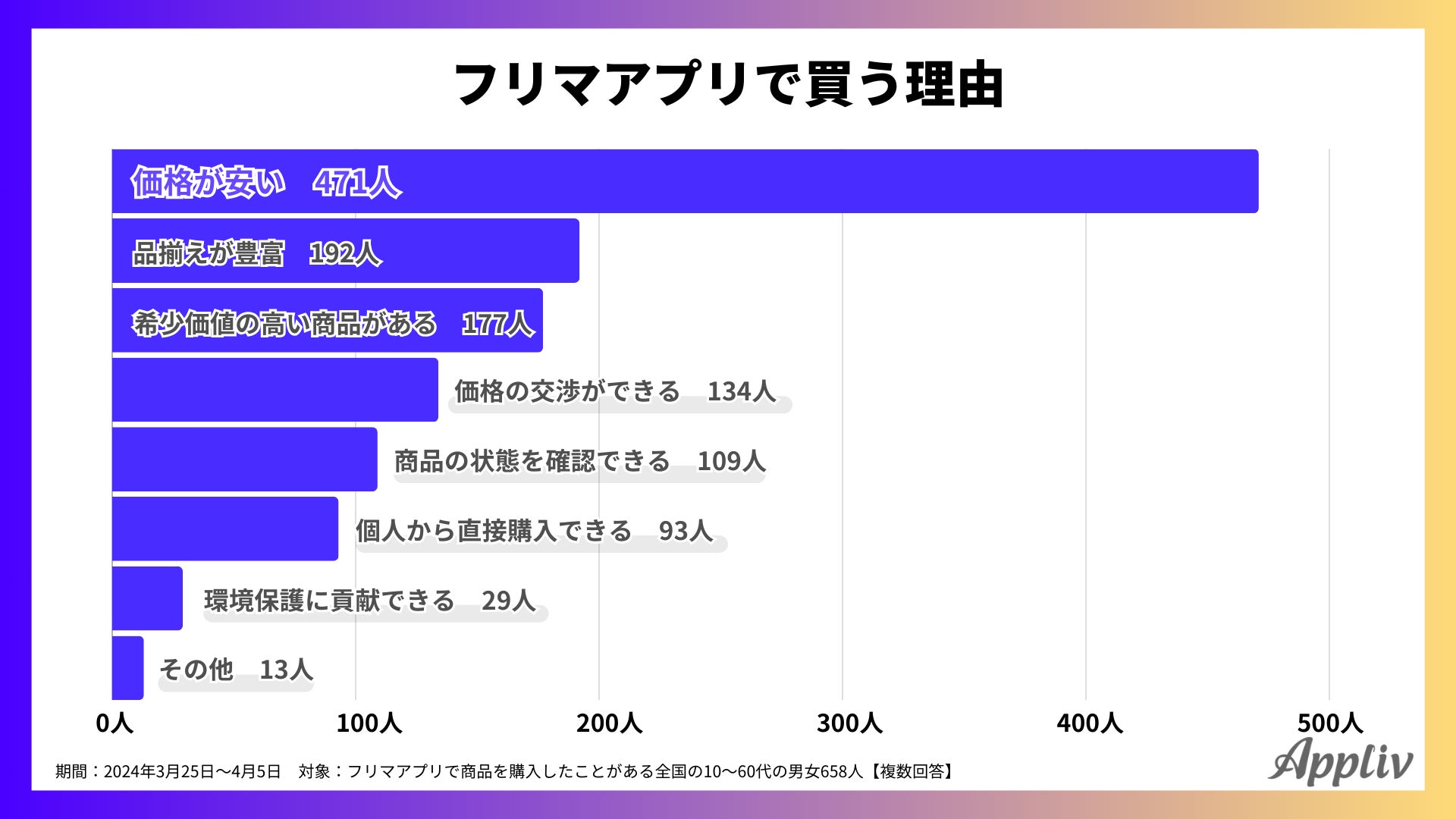 フリマアプリで商品を購入したことがある人の購入理由を調査すると、最も多いのは「価格が安いから(471人)」、次いで「品揃えが豊富だから(192人)」、「希少価値の高い商品があるから(177人)」でした。