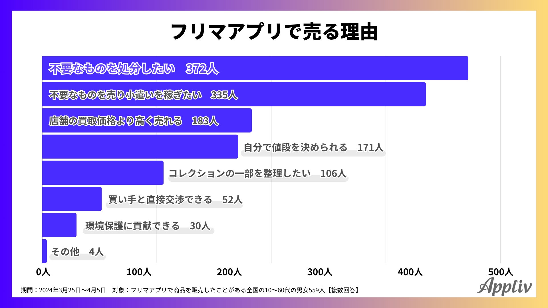 - フリマアプリで売る理由1位は「不要なものを処分したい」、「小遣いを稼ぎたい」を上回る