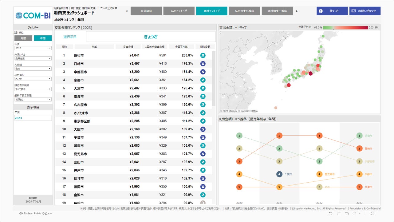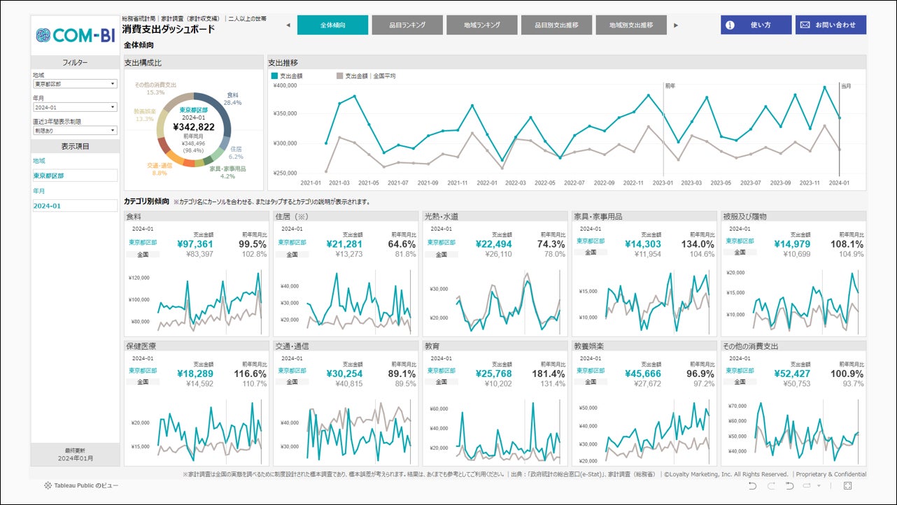 共通ポイントサービス「Ponta(ポンタ)」を運営する株式会社ロイヤリティ マーケティング(本社:東京都渋谷区、代表取締役社長:長谷川 剛、以下「LM」)は、2024年4月9日(火)、総務省統計局が実施する「家計調査」のデータを用いて消費支出の全体傾向や地域別・品目別の支出推移、ランキングなどを確認できるダッシュボードを、データをビジュアライズして共有するプラットフォーム「Tableau Public」で公開しました。