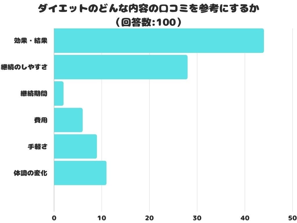 ダイエットのどんな内容の口コミを参考にするかをアンケートにて調査したところ、1位は「効果・結果」でした。
