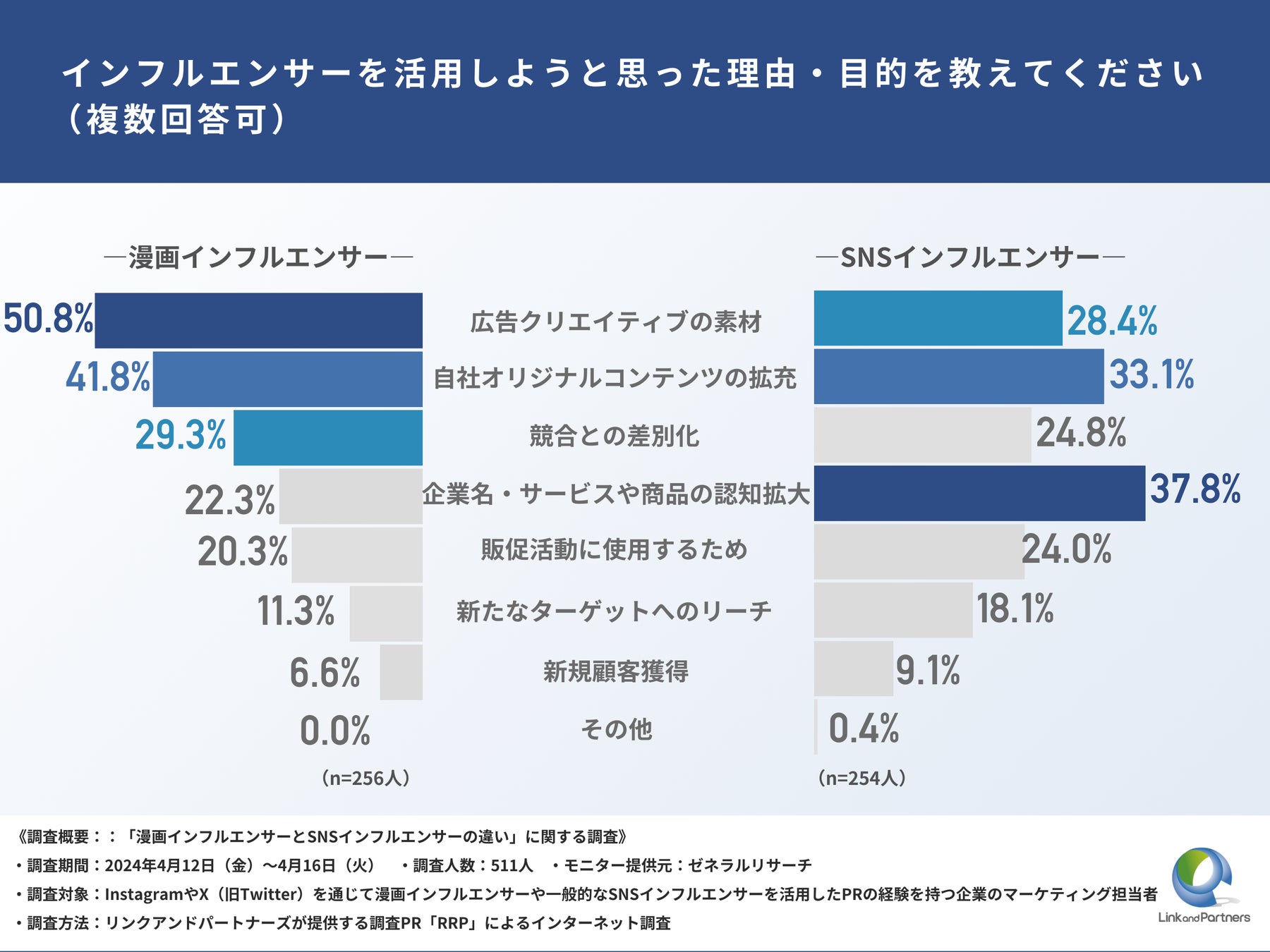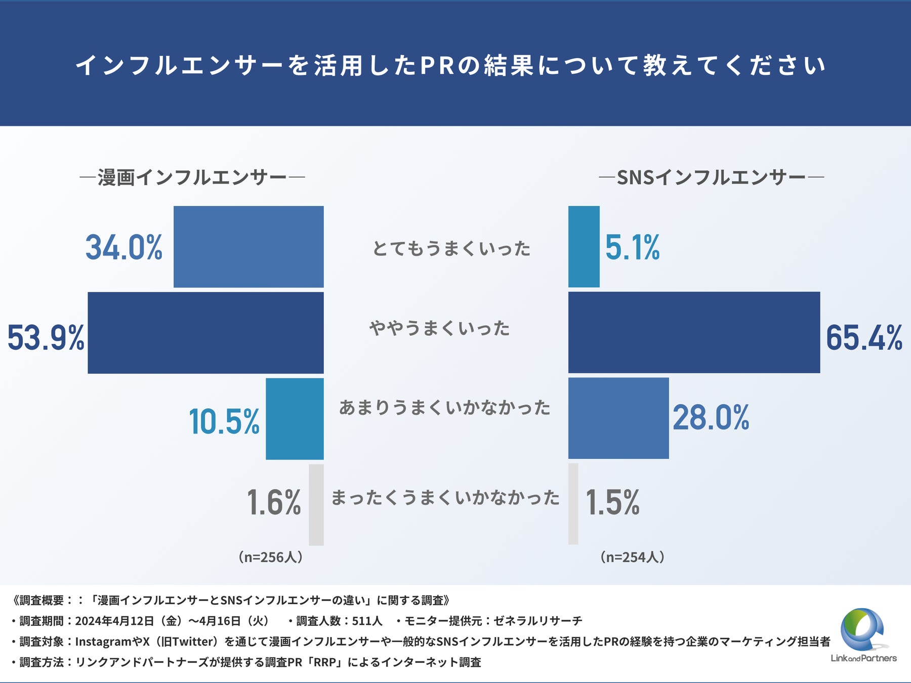 今回、株式会社リンクアンドパートナーズは、InstagramやXを通じて漫画インフルエンサーや一般的なSNSインフルエンサーを活用したPRの経験を持つ企業のマーケティング担当者511名を対象に、「漫画インフルエンサーとSNSインフルエンサーの違い」に関する調査を実施しました。