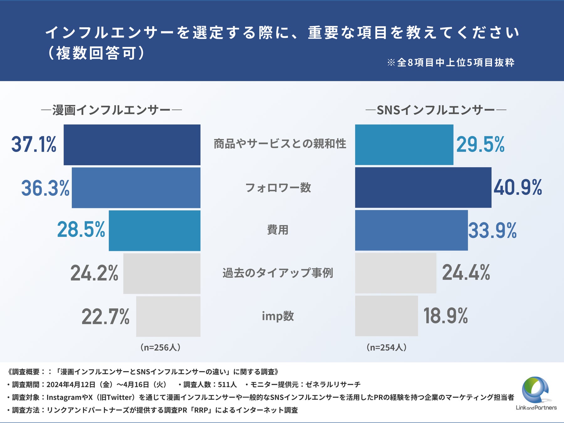 また、インフルエンサーを選定する際の重要な項目として、漫画では『商品やサービスとの親和性』が最も多い(37.1%)一方、SNSでは『フォロワー数』が最も多い(40.9%)ことがわかりました。