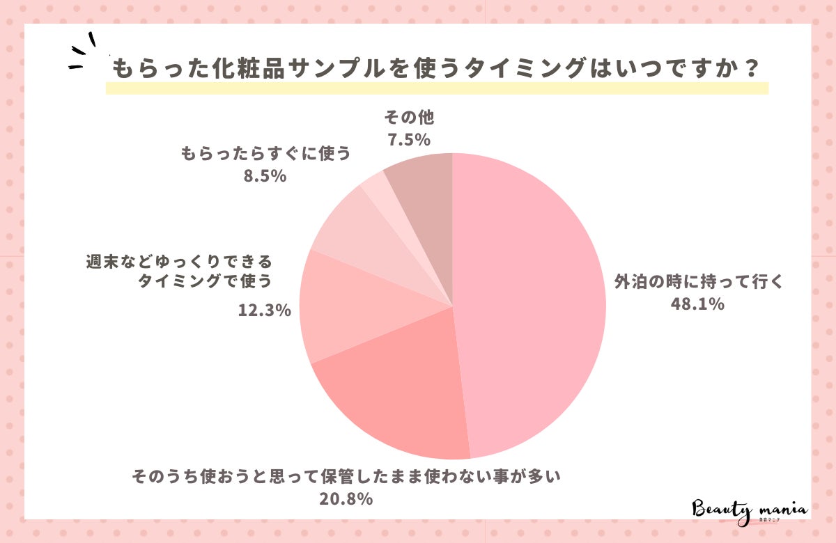 「もらった化粧品サンプルを使うタイミングはいつですか?」とアンケート調査した結果、1位は『外泊の時に持って行く(51人)』、2位は『そのうち使おうと思って保管したまま使わない事が多い(22人)』、3位は『週末などゆっくりできるタイミングでなるべく早く使う(13人)』となっています。