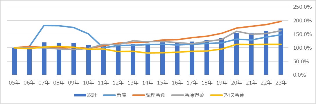 冷凍食品市場が拡大し始める以前の2005年度の供給金額(売上高)と比較すると、2023年度は171.1%に伸長しました。商品カテゴリ別には年々伸長を続ける調理冷食が2005年度比196.5%、冷凍野菜は2005年度比162.5%と大きく拡大しました。