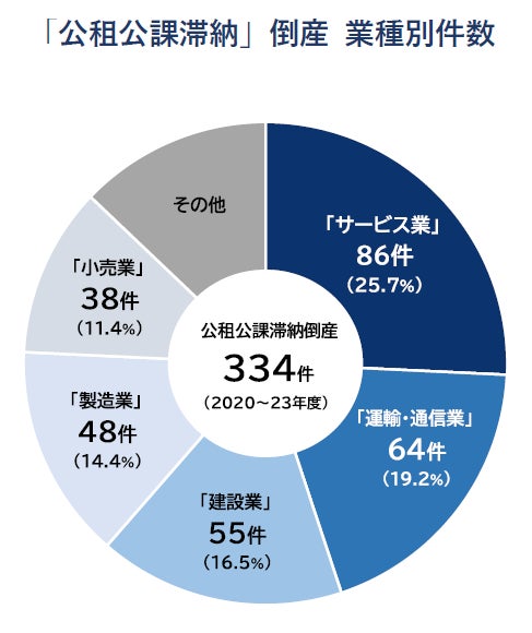 2020~23年度に発生した334件を業種別にみると、最も多いのは「サービス業」の86件で、ソフトウェア開発などの業種で多く発生した。トラック運送などの「運輸・通信業」(64件)や「建設業」(55件)、「製造業」(48件)などが続いた。