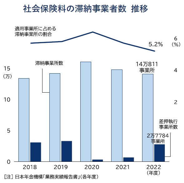 日本年金機構によると、厚生年金保険を含む社会保険料を滞納している事業所は、2022年度末時点で14万811事業所に上り、適用事業所全体に占める割合は5.2%を占めた。前年度に比べて滞納事業所数は減少したものの、依然として多くの企業が納付に苦慮する状態が続いている。