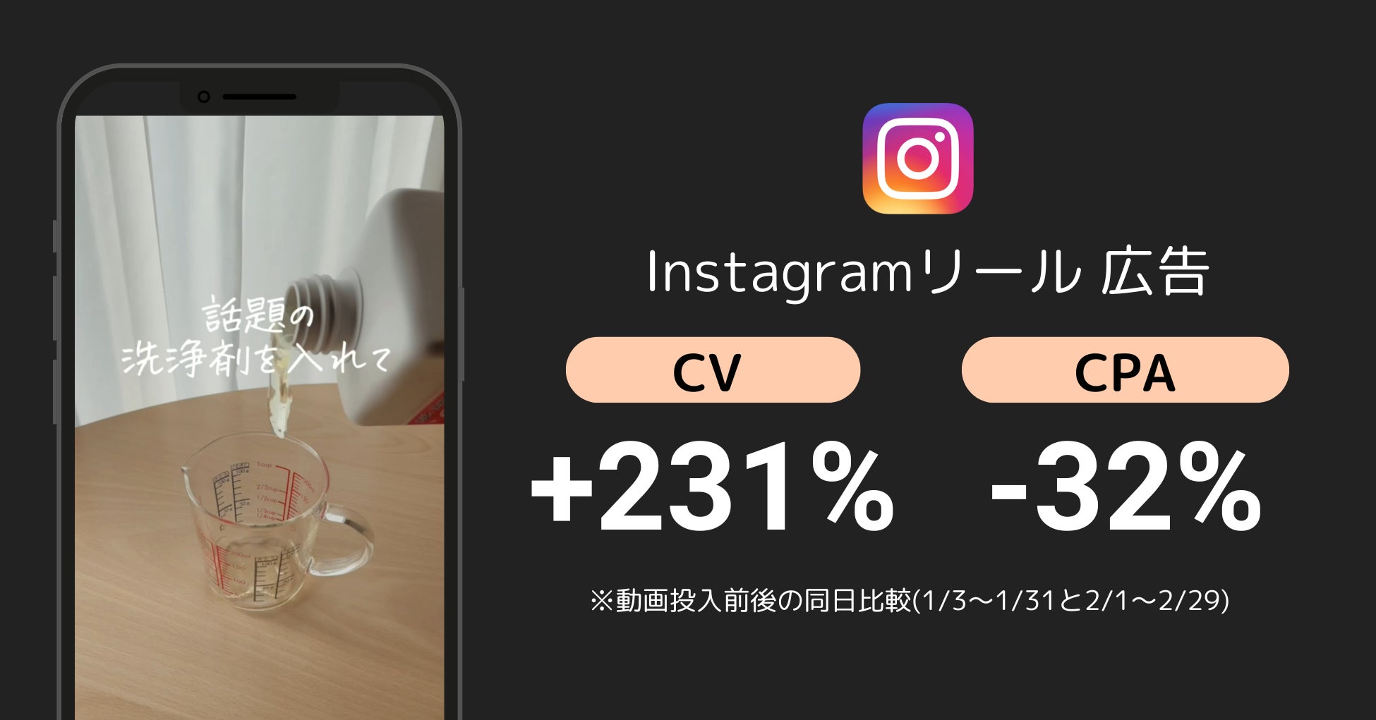 完成した動画をInstagram広告に活用した結果、動画投入前と比べ購入CPAが-32%、購入数は+231%と大幅に増加しました。