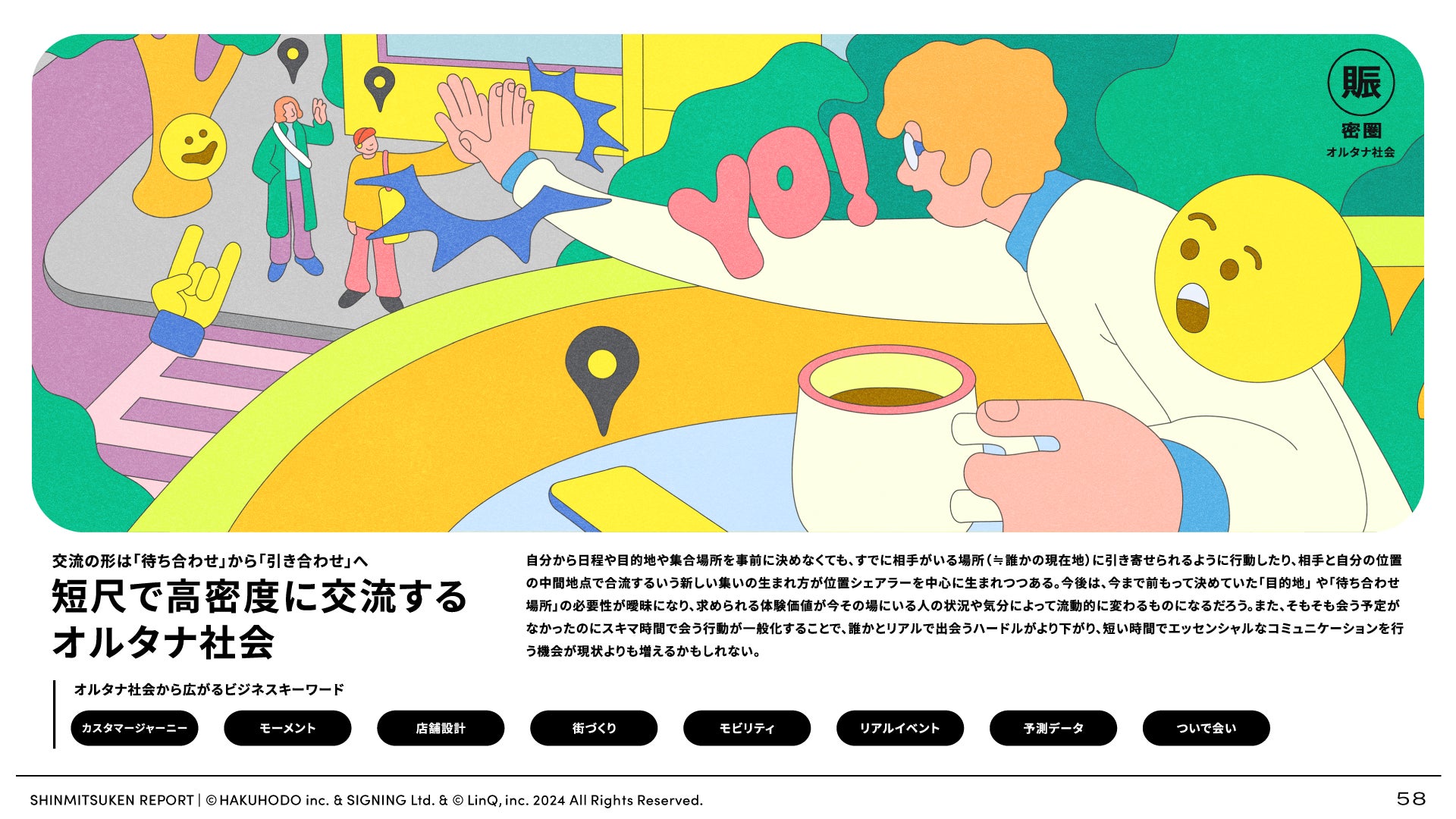 社会のオンラインシフトを背景に、「人と人とのつながり」のあり方が変化しています。「シン密圏プロジェクト」では、SNSが生活のインフラとなった現代における「親密さ」を捉え直すべく、Z世代を中心に広がる位置情報のシェアに着目。位置をシェアすることで生まれる、“親しさ”から拡がる新たなつながりを「シン密圏」と名付けました。レポートでは、その実態を紐解くとともに、「シン密圏」が世代に閉じた現象ではなくZ世代を超えて幅広い世代に広がりうる価値観と捉えたときに、これから訪れるかもしれない、選択可能でオルタナティブな社会の姿を「オルタナ社会」として提言し、ビジネスを考える上で示唆となるキーワードを提示しています。